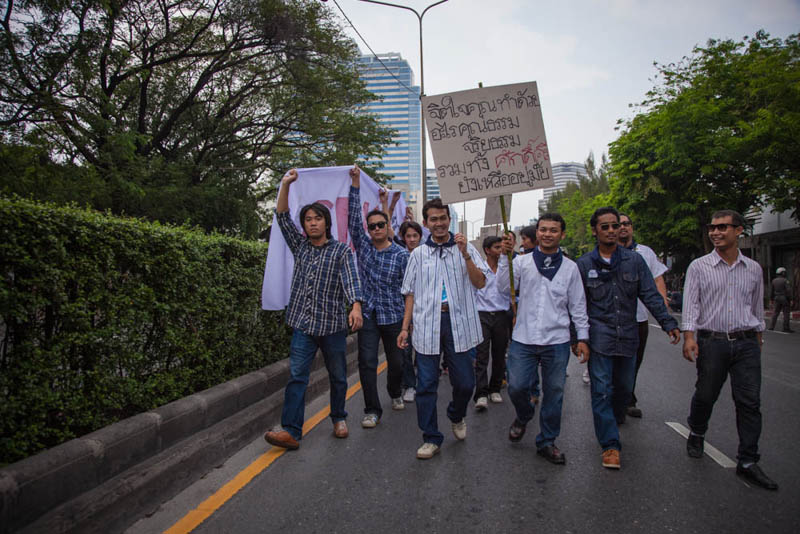 Many signs that protestors held aloft during the rally reflected Suebpong’s statement. The protesters suspected that Chulalongkorn’s plan to develop the land for educational purposes was not in earnest. Marching along Phaya Thai Road, protestors approached Chamchuri Square – a 21-rai space at a corner of Sam Yan Intersection that Chulalongkorn turned to a five-star high-rise condominium, office building and shopping mall in 2007.