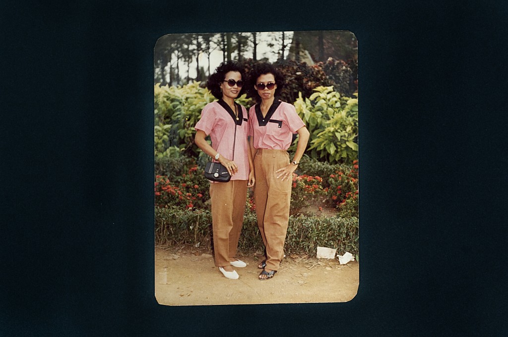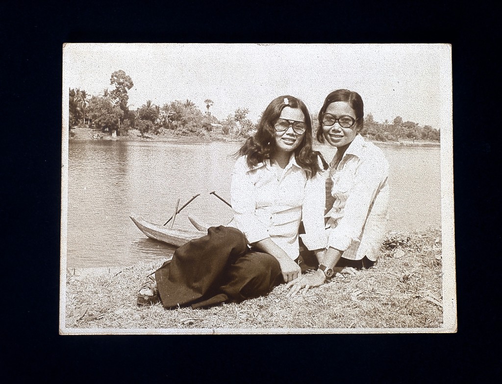 Two Cambodian women sport identical hairstyles, blouses, trousers and shades, posing for a photo in front of a garden of flowers. There is a sense of peace about this shot, but there’s also a surreal disbelief that there they stand, barely a few years after living through a genocide.