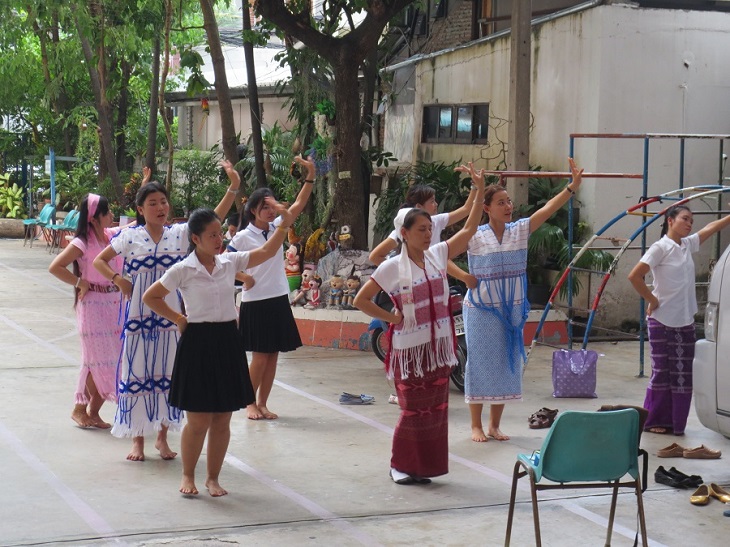Karen girls practice a traditional dance at DEAR Burma, a nonprofit language school for migrants in central Bangkok. Photo: Sarah Hucal