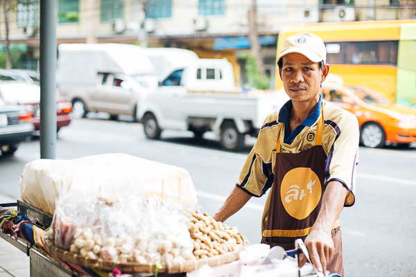 SOULS OF BANGKOK — Boonsong, 43 of Buriram, comes to work in Bangkok during the dry season. He leaves his rice farm back home to work as a street vendor in the capital. He sells corn, taro and beans in an area bounded by Nang Lerng, the BMA City Hall and Old Siam Plaza. He loves working freelance as a seller for two reasons: freedom and cash.