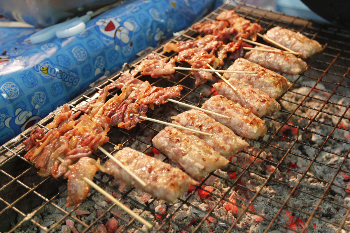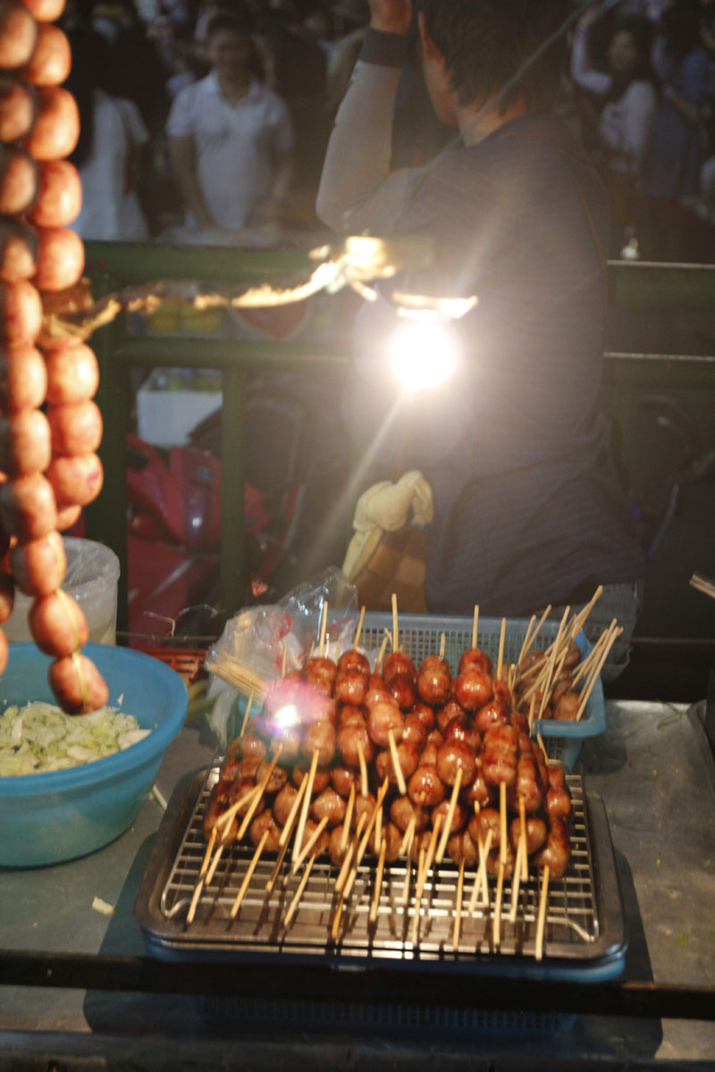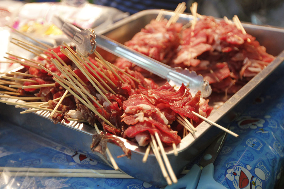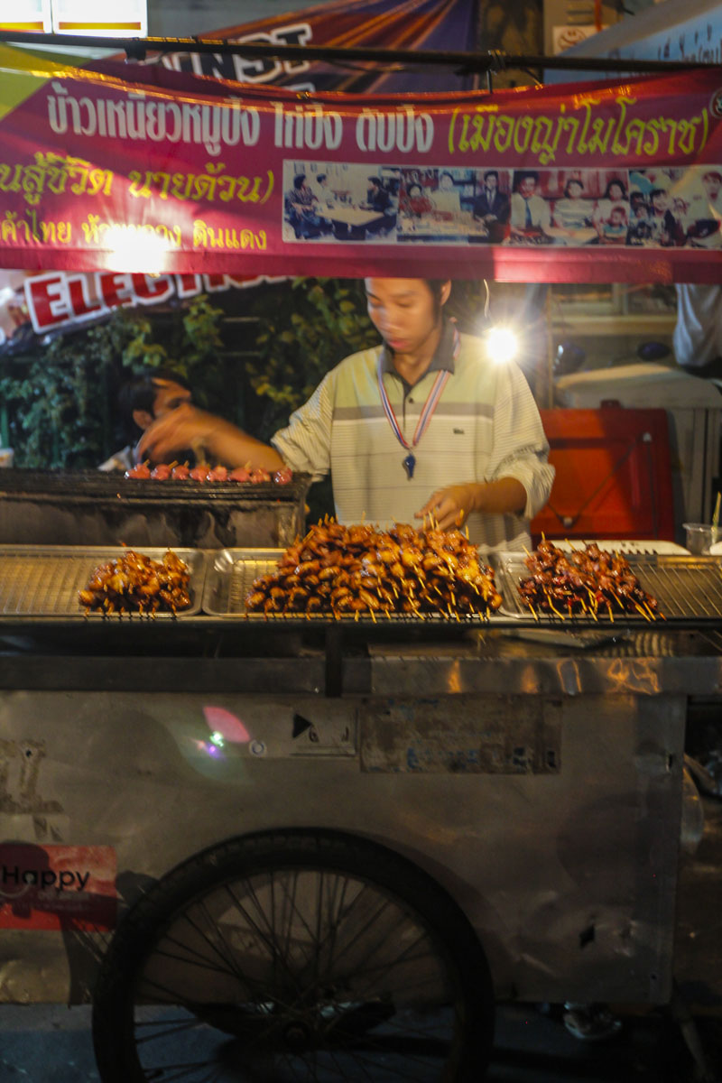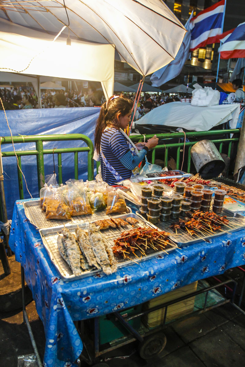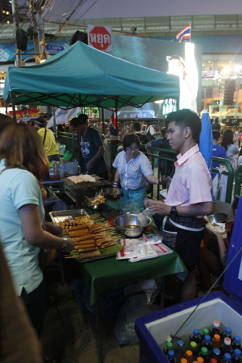 Earth, a twentysomething Soi Cowboy resident and moo ping seller, told us “I usually sell at Soi Cowboy, but I would be going to the protests anyway.” So he hung a whistle around his neck and wheeled his cart out the occupied Asoke road. “Business is great,” he said. “Better than normal.”