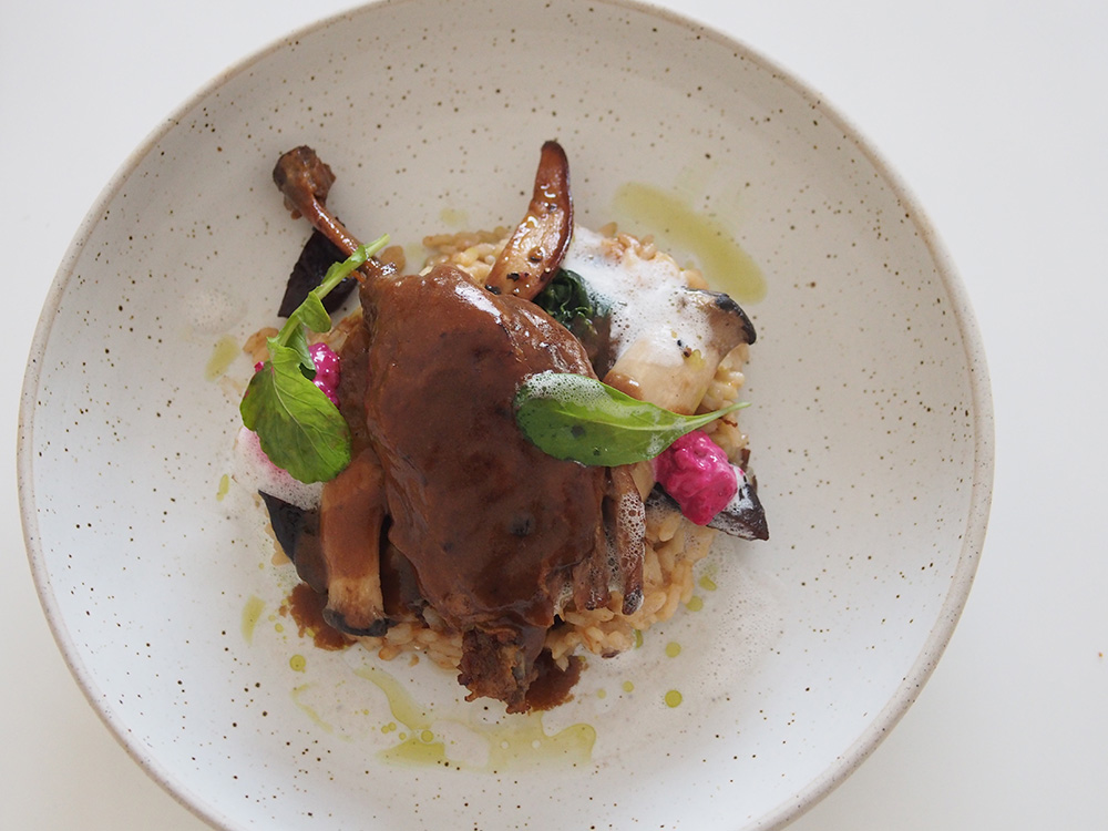 Duck Confit with Prune Risotto and Sautéed Spinach