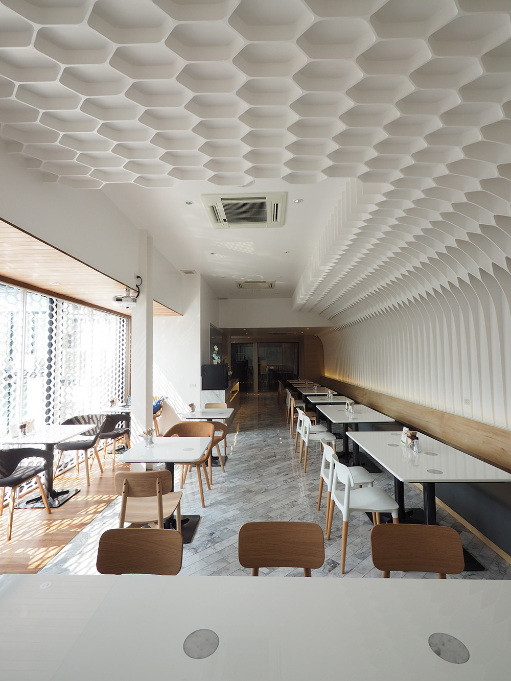 It’s tucked away on the third floor of an art mall and boasts interiors the stuff of Pinterest. Overlooking about 30 canteen chairs and cushioned booth seats is a chalk-white feature wall shaped like a honeycomb. Underneath your feet is a spiffy marble floor balanced out by a strip of wood paneling near the floor-to-ceiling windows, which retain their original Art Deco grille.