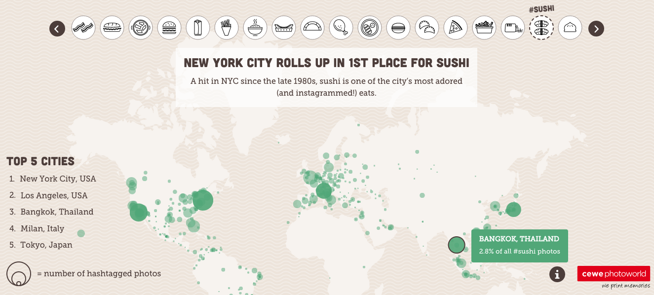 Bangkok is also shown to have a serious fetish for sushi, as we came in third place for #sushi photos after New York City and Los Angeles.