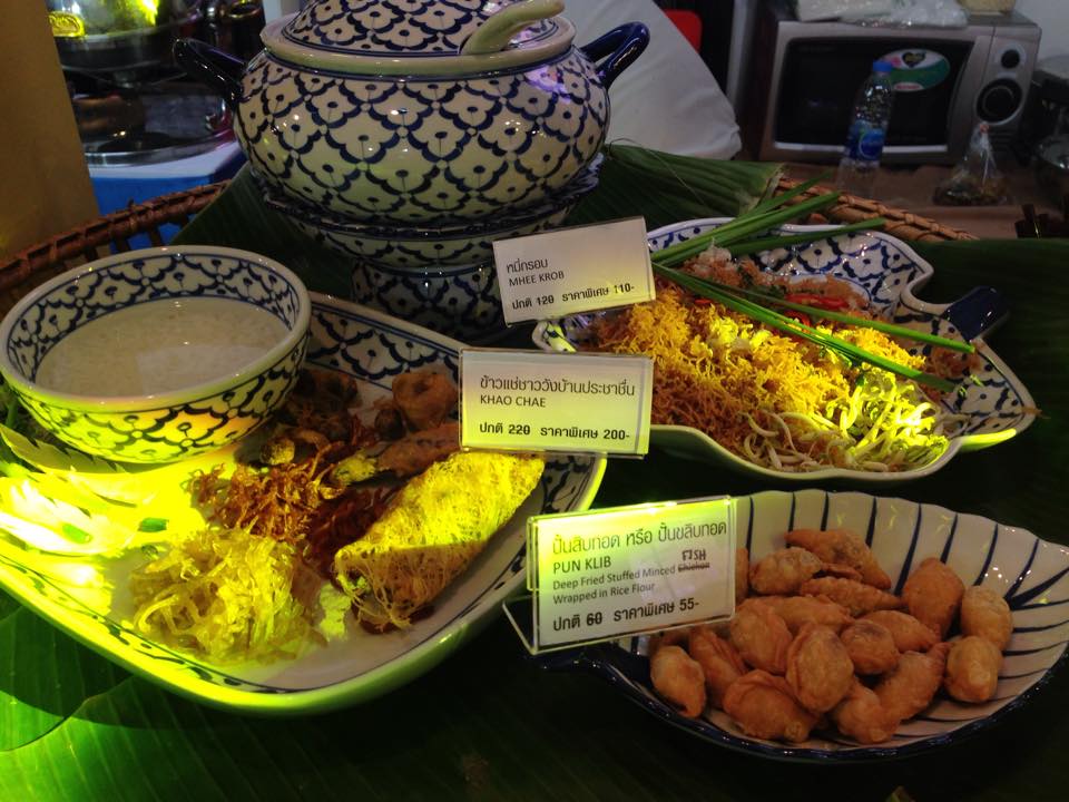 Adapted from the Mon folk of the Irrawaddy, summertime rice was originally a simple bowl of rice in perfumed, cold water served alongside a few deep-fried accompaniments. But as with nearly every other cultural import, Thais have “elevated” the dish to a visual – as well as culinary – demonstration of the cook’s kitchen prowess. Hence the song-and-dance with the rice, which must be polished to ensure the water stays clear. The sweet-smelling jasmine blossoms and rose petalsmay not taste particularly good, but they add a nice perfume to the bowl.