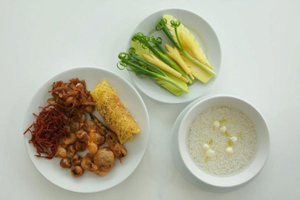 Adapted from the Mon folk of the Irrawaddy, summertime rice was originally a simple bowl of rice in perfumed, cold water served alongside a few deep-fried accompaniments. But as with nearly every other cultural import, Thais have “elevated” the dish to a visual – as well as culinary – demonstration of the cook’s kitchen prowess. Hence the song-and-dance with the rice, which must be polished to ensure the water stays clear. The sweet-smelling jasmine blossoms and rose petalsmay not taste particularly good, but they add a nice perfume to the bowl.
