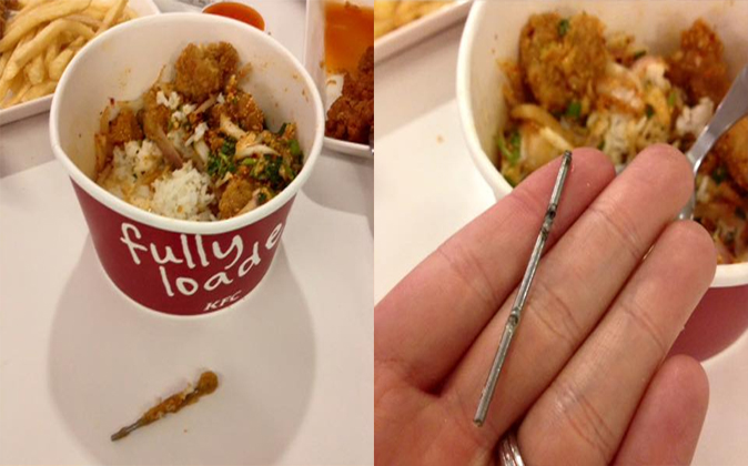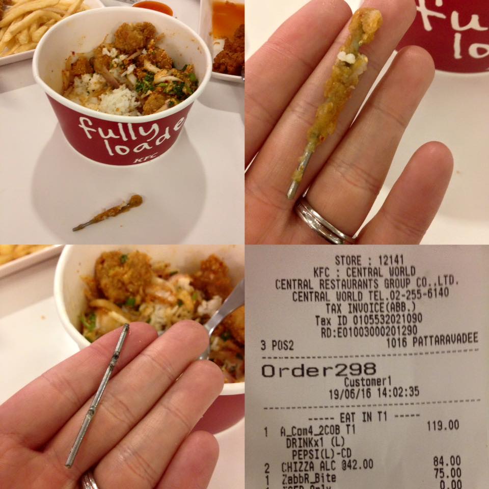 Facebook user Vid PL posted a complaint on the official page of KFC Thailand that he unexpectedly found a metal stick in his Khao Yam Gai Saab (Spicy chicken salad with rice).