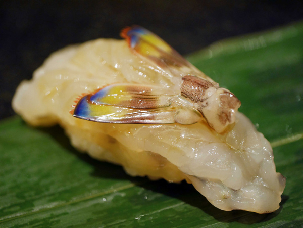 What you can anticipate is a nonstop sequence of 10-plus exquisite fish and rare seafood courses – some of which you’ve probably never seen so fresh. Starting with an appetizer, just enough sashimi to get you taste buds working, then in no time, your sushi will be lining up on a single piece of leaf before you. (Instead of a ceramic plate, Sushi Kanda serves stylishly on leaves over the counter.) The list of seafood runs from tuna, kinmedai, aji, saba, uni, Hokkaido scallop, to ikura and the less common kuruma ebi. Everything boasts the best of quality and freshness. The uni (sea urchin) is shipped from the very same vendor that supplies for Sukiyabashi Jiro. It is by far the most enchanting pop of Uni I’ve ever had in my eating career. The ocean tastes very sweet in my mouth. Nom. Nom.