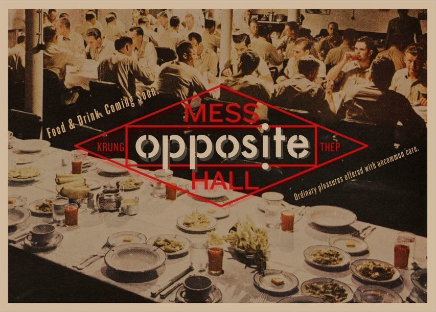 DINING DISPATCH – A new dimension will soon be added to the already popular Opposite venue, across from WTF on Sukhmvit Soi 51. The owners felt like it was time to maximize the full potential of the space rather than limit its use to poetry nights and pop-up dinners so they’ve expanded it to include a full-scale bar and a fully operational kitchen, hence the addition of “mess hall” to the name.