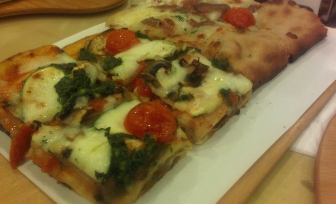 There are a few reasons Pala has got our juices flowing. First, they serve pizza by the slice (or by the half-meter or meter if you so desire). The rectangular pies are ready made and on display at the front of the restaurant. For the indecisive diner, the kind of person haunted by opportunity cost, the kind that always, without fail, orders his pizza “half and half” (i.e. this writer), this is a wonderful thing. If you come in a group, you can basically order every pizza on the menu. The slices themselves are cut into smaller slices before they’re served, so everyone gets a piece of every pie, so to speak. Party on.