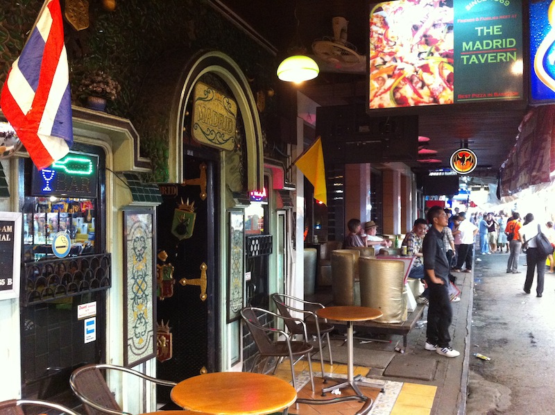 First, some advice on how to arrive unscathed at this bastion of exiled Americana. From Silom Road, turn onto Patpong 1 and keep left. About 100 meters down the street – which famously hosts establishments with names like “Superpussy” and a night market hawking shiny garbage to tourists – you will find Madrid’s handsome threshold. Along the way, turn down all offers related to table tennis. I cannot emphasize this enough. (However, it is customary to count every time you hear someone say the words “ping pong” and, on entering Madrid, to knock back one shot of your favored poison for every time you heard the phrase. Seriously. Everyone does this.)