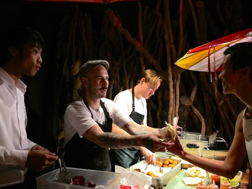 For the second of his recent pop-ups, which took place on May 3, Barnes changed it up. This time he partnered with Lotus Arts de Vivre, the design company run by a dynasty of Bangkok society types, the von Buerens. What ensued was a party at the family’s gallery space on Rama III Road. And what did Barnes choose to cook for a resolutely hi-so crowd that might have emerged straight from the pages of Thailand Tatler? Street food, of course.
