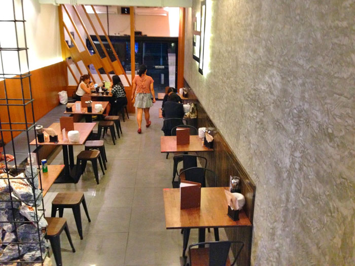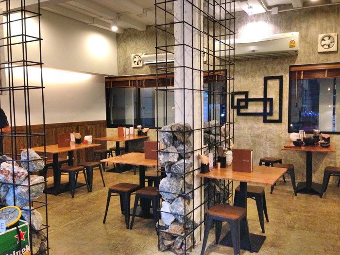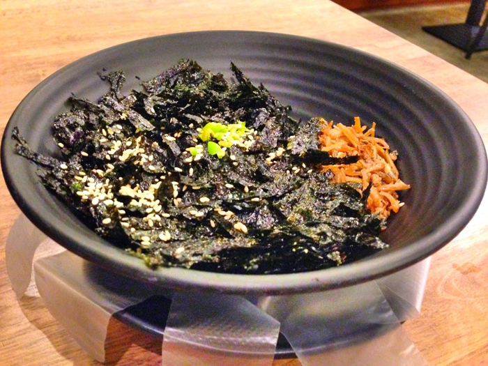 Providing the essence of Korea with dark, wooden furniture in an otherwise casual manner, the restaurant’s second-floor space is punctuated with pillars from which hang wire cages holding chunky stones. Why? Because it looks cool, and that’s how their restaurants are decorated back in the Land of Scholarly Gentlemen, as Korea was once called.