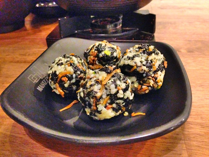 The recommended Rice Ball with Anchovy or Tuna (THB150) was served in a bowl with all ingredients waiting for us to mix together and shape into rice balls. The waiter asked us if we’d like him to do it for you, but getting our hands dirty was the fun bit (actually your hands won’t get dirty, as they provide a plastic glove). The anchovy was harder to ball up, but offered a crispier texture with a slightly too-sweet flavor, though interesting to try beyond simple fish like tuna.