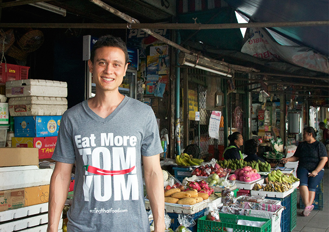 Whether he didn’t want to be tethered to debt or just loved selling junk, the 28-year-old foodwriter is now, some years later and continent away, striding through Terminal 21 on a recent afternoon in a baggy grey shirt reading “Eat More Tom Yum,” a black messenger bag, and unassuming sandals.