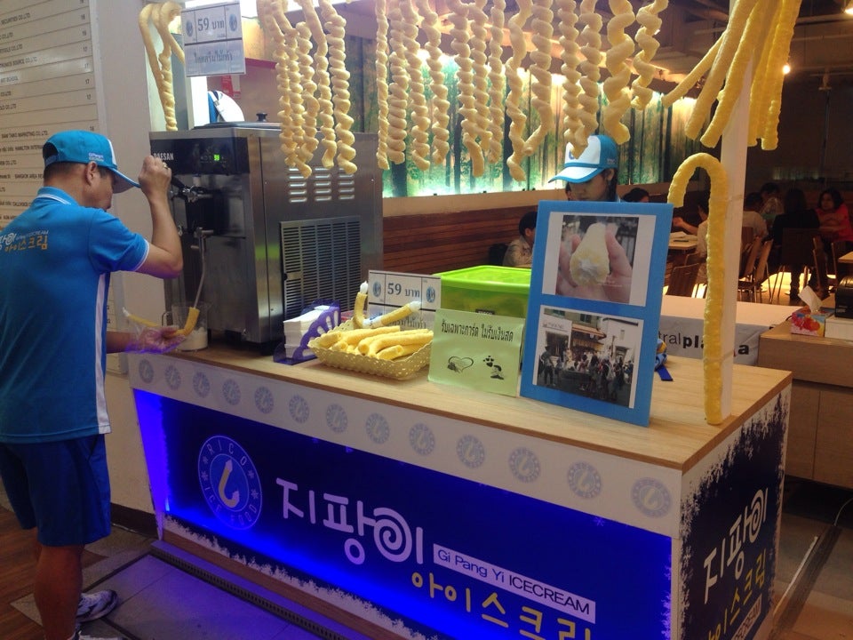 “Gi Pang Yi,” a Korean soft-served vanilla ice-cream brand has recently landed two carts in Bangkok, and has gained a fair amount of attention from locals who are curious and happy to whip out three 20-baht bills to try the weird-looking ice-cream.