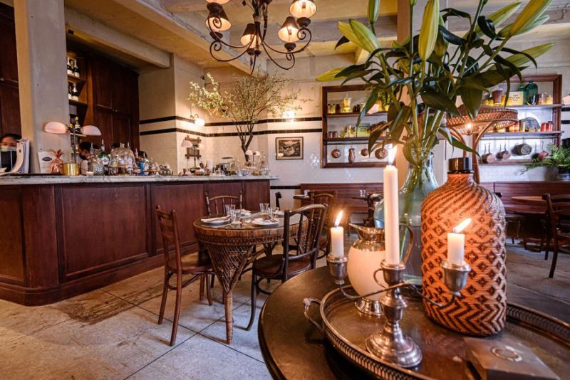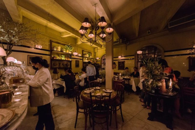 Everything from the lighting to the silverware was handpicked by owner Nopadon “Ou” Baholyodhin (who also owns Rongros near Tha Tien Pier and Rong Sabiang in On Nut). Arched windows with cafe curtains sit above a long wooden bench extending around the restaurant, contrasting walls of white subway tiles to give that true bistro effect. The marbled bar in the corner displays pastries in beautiful glass domes while foxed-mirror shelves are decked out with copper pans, cake molds, cookbooks and antique cookware.