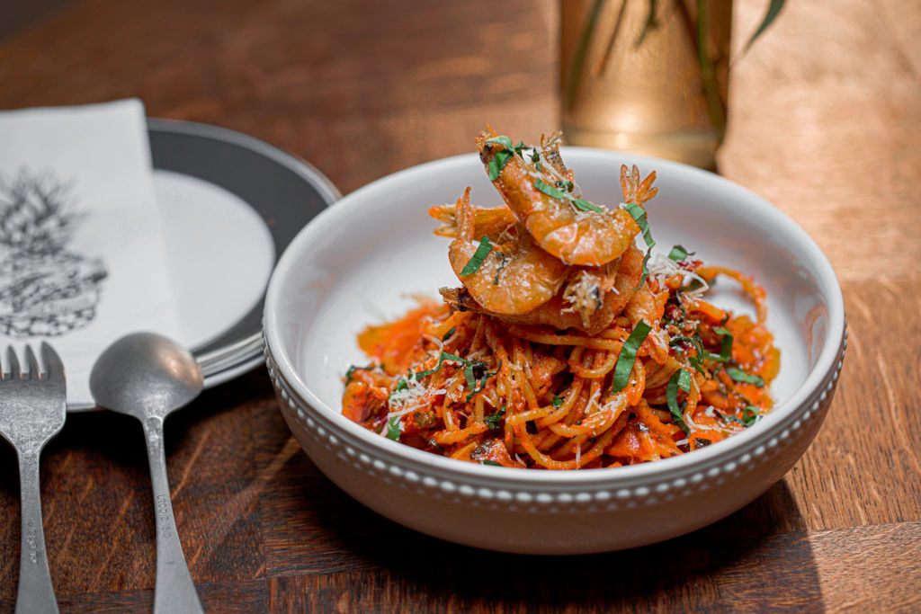 European comfort food takes center stage through straightforward dishes that are chock full of flavor. Start with the light-as-air chicken liver pate (THB320) topped with white raisins and pistachios and served with sourdough toast, or go for the all-time classic calamari fritti (THB280) paired with aioli and fresh lemon. For bigger bites, move on to pasta dishes like the Doppio Nero (THB520), a fresh squid ink pasta mix topped with crab meat and a hit of chili, or the spaghetti alle vongole (THB380) made with seasonal clams and a briny white wine sauce.