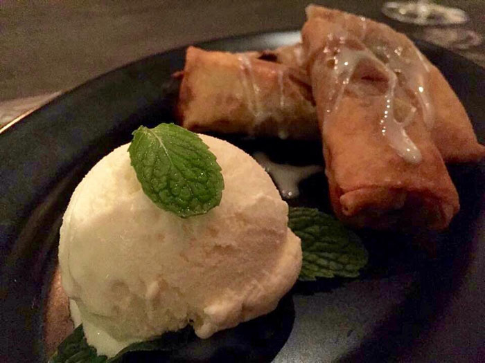 To finish off your meal, of particular note is Chrysanthemum Panna Cotta (THB220) that arrived with a modern twist; having oriental flavor of Kekhuay (Chrysanthemum) merged with a well-known Italian dessert, Banana Chocolate Spring Rolls (THB170)–fresh banana, sun dried banana slices which were very sweet, plus chocolate wrapped in spring rolls and topped up with condensed milk and vanilla ice-cream. Well, if you are not a glucose lover, we must say you need something else to balance out the taste, or if you’re not yet too full, opt for another dessert, Frozen Passion Fruit Tart, would nail the sickly sweet spring rolls with its clean sour tang.