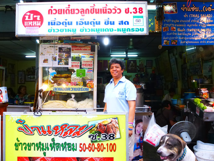 Somboon Chatcharoenmongkol and her red pork and crispy pork belly in rice stall.