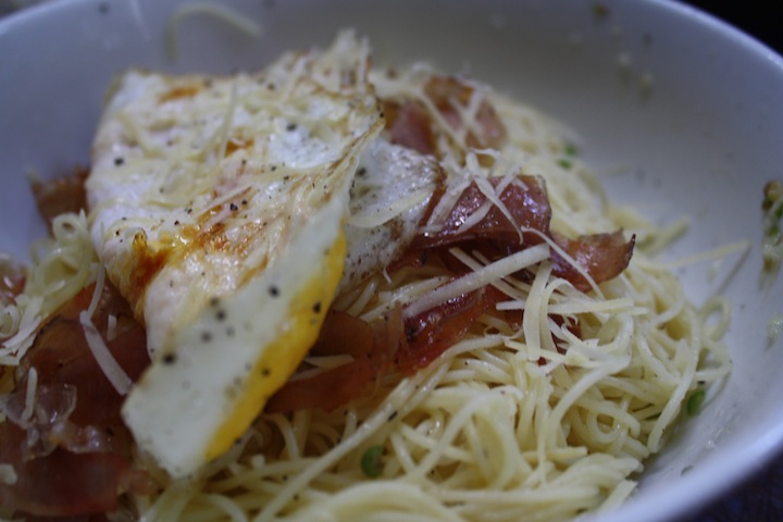 COOKING WITH MEREDITH- Back in my college debauchery-filled youth I would often careen home from the bars craving fat and carbs. On one particularly early morning I flung open the door of my fridge and threw a few pantry staples into a bowl while angel hair shimmered on the stove. Five minutes later I was gorging on my new pasta creation – Spicy Spag Carbonara.