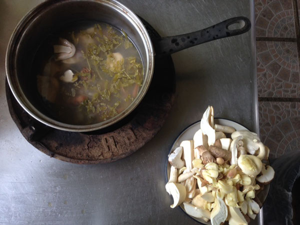 A tamarind shoot soup and mushrooms ready for the wok at Oo Khao Oo Pla restaurant. Photos: Chawadee Nualkhair