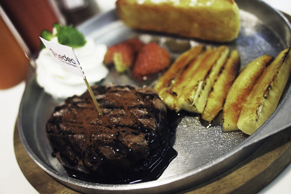 The “Steak” (THB159) is made of Cookie-and-Cream or White Cracker piecrust, topped with a thick layer of ice cream and coated with chocolate-caramel syrup. Depending on how you would like your steak cooked, the ice cream flavors will be of different flavors. With “Medium-Rare Steak,” your “meat” will taste of brownie and pink-milk ice creams; with “Welldone Steak”—creamy Hazelnut Chocolate; and with “Fillet Steak”—Banana Caramel. All Steak orders are served with a savory-sweet Parmesan toast, caramelized banana sticks (that look just like fries), and a side of a fresh strawberry and whipped cream. When combined the dish hardly looks like ice cream.