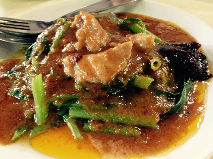The dining room resembles a school canteen with long tables and mismatched blue chairs. A Chinese-style round dining table set stands at the back of the restaurant. Miss Sanguansri is gone so we couldn’t ask, but we took this to mean ambience and decor were not priorities; rather, all her energy was dedicated to the cuisine.