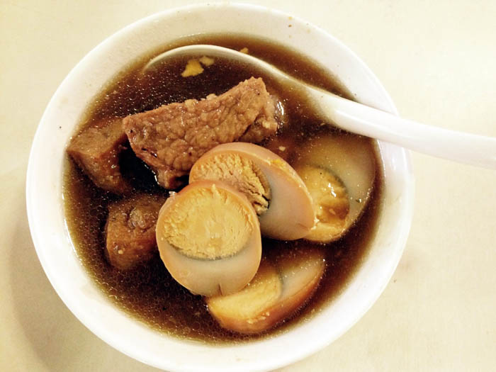 Cold Chinese tea was served the minute we arrived without needing to order (free!). Followed by some signature dishes suggested by an old-yet-active waitress who said she’s worked there over half her life. The street-meets-ancient Thai dishes such as Kaeng Jued Look Rog (Chicken Consomme with Egg-in-pork intestine Sausage and Vegetable, THB60) delivered us the naturally sweet flavor from the boiled-onion texture, which was almost blended together with the soup.