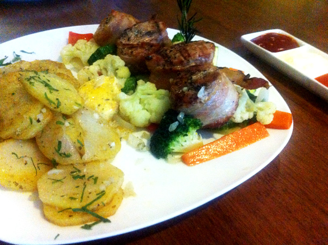 Likewise, the Schweinemedaillions, or “pork medallions” (THB310), had the right idea but lacked a depth of taste. Comprised of grilled pork fillet, wrapped in smoked bacon and served with fries and sautéed vegetables (although we substituted fries for mashed potatoes), the dish was to its credit colorfully presented.