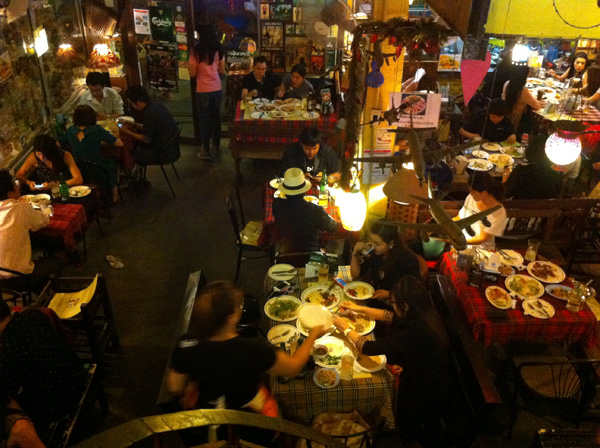 Seated in the intimate “attic,” I’m handed a menu (in both Thai and Thinglish) and immediately order a beer as I once again take stock of my surroundings. The upper level is as eclectic as the lower, with mismatched furniture and sofas hosting merry meals on six to seven tables. Half of me hopes the story of the play list is false as I spot the faces of Telly Savalas, Paul Young and Suzi Quatro, while I vow to leave if “Under the Boardwalk” by Bruce Willis comes on next.