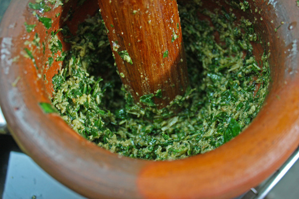 Begin the pesto by washing and stripping the leaves from the stem. To easily peel the basil leaves hold the stem at the top and with your other hand firmly grip the stem and pull in the opposite direction. The leaves will fall off the stem effortlessly. I like to pulverize the basil in a som tam mortar and pestle, but a blender or food processor will do the job with less effort. If you choose an electrical method, simply load all of the pesto ingredients and hit the start button. Slowly swirl in the olive oil and finish with parmesan cheese.