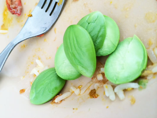 No, it’s those little green stinkers known for perfuming pee and fueling smelly farts: sataw, known as the “bitter bean” or more evocatively, the “stink bean.”