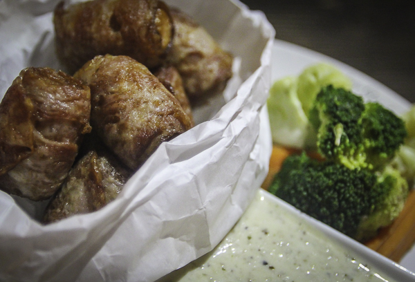 Great drinking food like the delicious muu sa ding(160THB) or “bouncing pork”dominate the menu. These morsels of piggy tenderness are served with green seafood sauce in lieu of the usual Isan nam jim. The cocktail weenies are wrapped in bacon(185THB) are also excellent snacking fare, as are a fried weenie-bacon combo. Top-notch Belgian brews are available at predictable prices: Hoegaarden(230THB/pint), Leffe (230THB/pint) and Triple Karmeliet (220THB/330cl).
