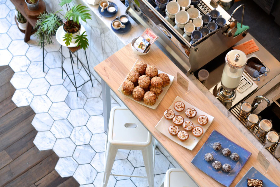 Behind the marble front bar, Rocket-branded coconuts peek out of glass-front refrigerators. Baskets brim with fresh produce waiting to be juiced into creations like the Alkalizing Green with cucumber, spinach, pineapple, lime (THB90). Shelves of wine bottles and Johnny Walker remind guests that the cafe offers a stacked list of alcoholic drinks in addition to caffeinated ones. Try the St. Tropez Smash, a tart mix of vodka, slow-juiced watermelon, passion fruit, vanilla bean, and fresh lime (THB275).