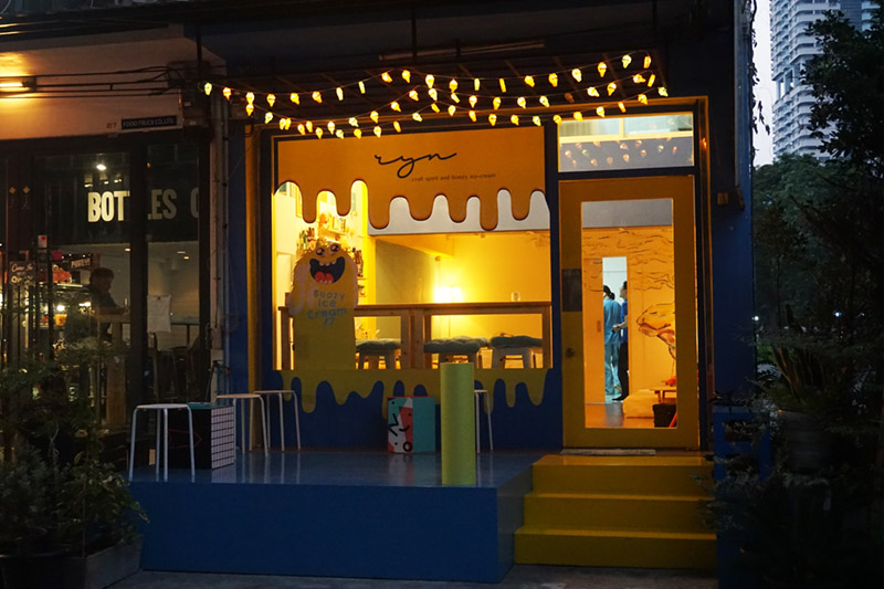 Forward-thinking entrepreneurial couple Iryn Vongvachjira and Tarin Chiarakul decided turn the first floor of their photography studio into Ryn Cafe, after they regularly had friends over to party there anyway. Tarin, who loves to drink and works full-time for liquor importer Bootleggers Trading, came up with the boozy ice cream idea because he wants to introduce Thai people to craft spirits in a fun way. Meanwhile Iryn’s talent for marketing and design turned the space into a bar, decorated in playful colors, comfortable futons, and stuffed animals to make guests feel at home.