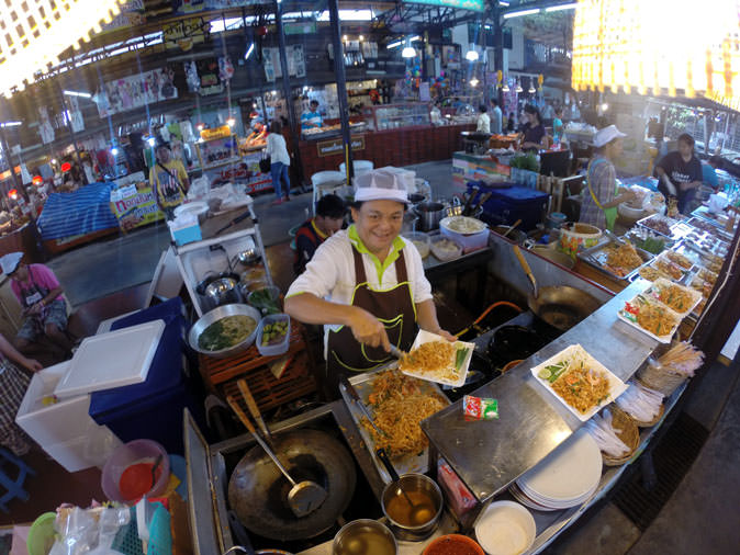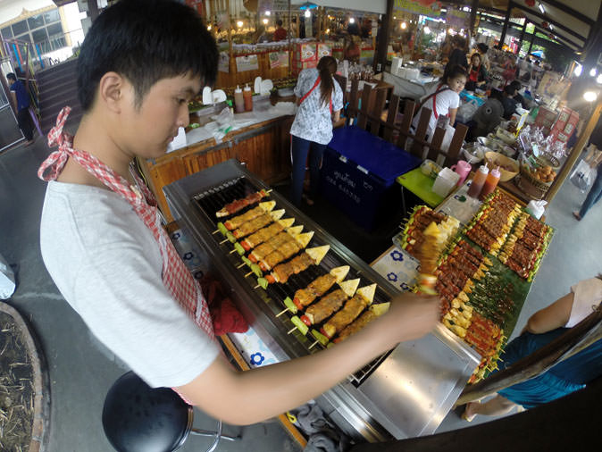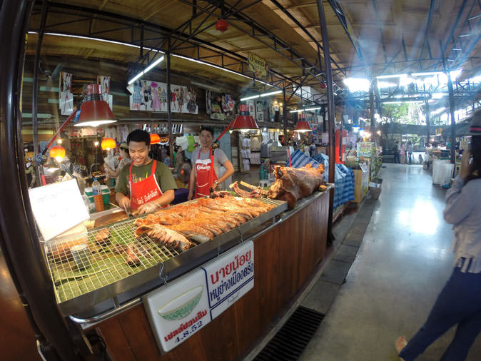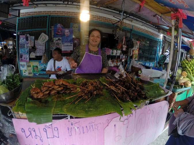 Although it’s almost sacrilegious to forego this ubiquitous bowl of flavor, boat noodles and kuay teow do get old after awhile. So past the boats are plenty of other interesting options such as skewers of bacon nibs slathered in a mix of chili and “tomato sauce,” or whole pigs that have been “grobified,” meaning they’ve been deep fried into a crispy texture where the belly fat melts in your mouth.