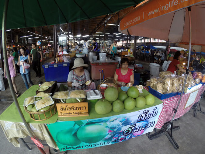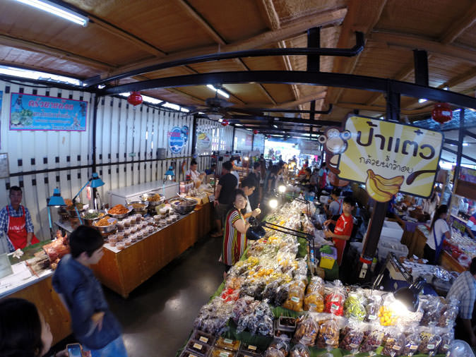 Walking through the market you’ll be assaulted by smells from every direction, and it’s hard to know where to go first. The trick is to start at the riverfront and then work your way out from there. Repeat this on both sides of the river. The layout of the market can be deceiving to first-time visitors. There are food vendor halls on both sides of Khlong Saen Saab, but both sides host vendors serving up unique specialties, so make sure to save room for bounty from the other side. There’s seafood carted in from Chonburi; Halal fare; Skewers of pork, beef, chicken; and chewy crocodile on one side. Succulent bpet yang, fatty duck; home-ice cream and kanom tarn on the other. Choose wisely as real estate in your stomach is valuable.