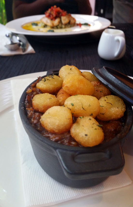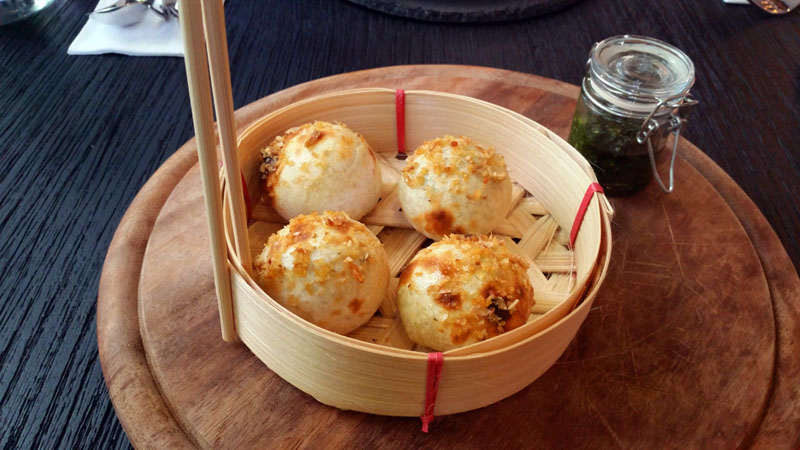 The eclectic menu starts with appetizers that strike strange combinations but surprisingly work. Take for example the seared watermelon, topped with cured pork belly and grape balsamic jelly cubes on the side. Pork and watermelon together is just a weird idea in theory, but in practice presents a delicious sweet and salty contrast. The balsamic cubes end up as a bit of an afterthought off to the side the plate, but when included in a single bite with the other two ingredients there’s a pop that’s purely next level. Likewise Japanese edamame beans and pesto sound like a very bad experiment in fusion, but when that edamame is wrapped inside a dough ball as a paste it’s a chewy delight, reminiscent of Chinese buns.