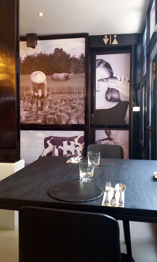 I walked in knowing only the buzz: Italics is the brainchild of Michelin-starred James Noble (formerly Mick Jagger’s chef) and 100 percent of everything served is sourced from Thailand. Indeed, the interior design echoes this commitment to provenance: Black-and-white, avant-garde photos of cows and women in sexy poses next to cuts of meat.