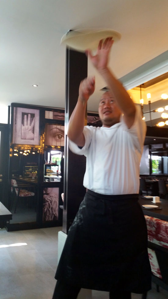 And when the menu says these pizzas are hand-kneaded and high-thrown, it isn’t joking. The chef, a young Thai guy with a swirly, shaved hairstyle, left the wood-fired oven (visible through a glass window) and tossed around a knot of dough in wild 360s.