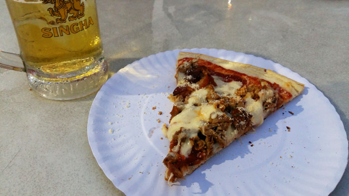 Throughout the rows of multi-ethnic food stalls are a number of isolated gems, but Who’s Pizza is the highlight of the mix. Grab an order of something else from a different stall, plus a slice of Who’s, and chances are, you’ll wish you had just ordered a second slice of pizza instead. Luckily the night is still young, so you’ve got plenty of time for more pizza after the next beer tower.