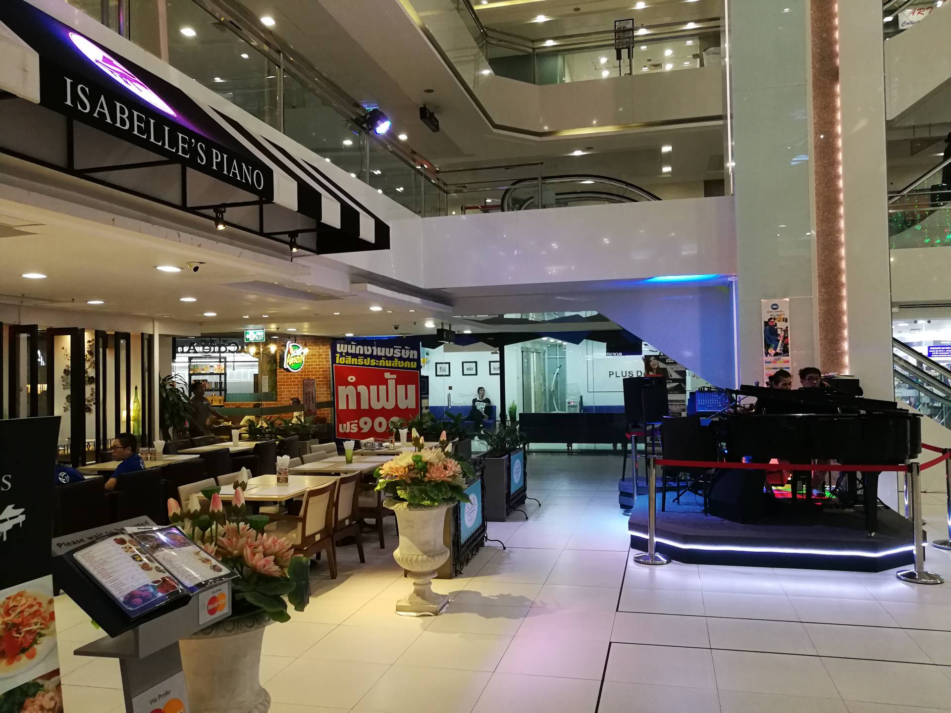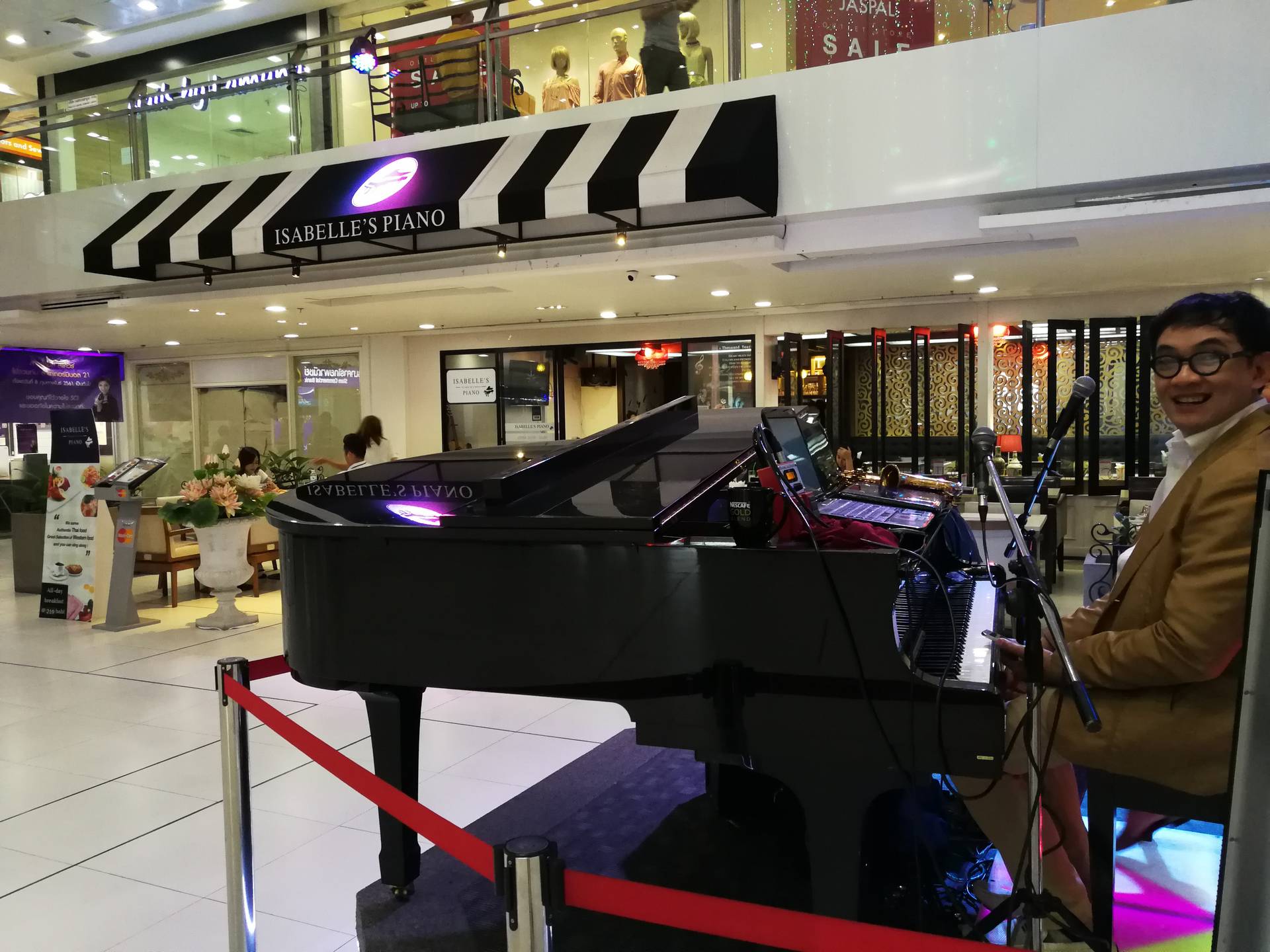 Isabelle’s Piano, in Asoke’s Times Square mall, is an open air cafe with a stage set in the center atrium of the mall. On that stage is a grand piano, a smiley pianist, a book of songs, and anyone that doesn’t mind their singing echoing through an entire mall.