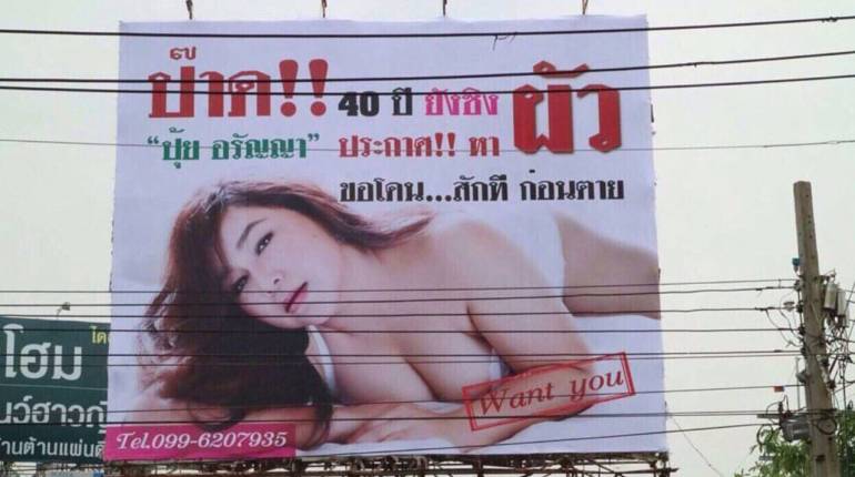What’s the best way find a nice man in Bangkok? Tinder? Dates with mutual friends? Nights out? The gym? How about sticking a sexy photo of yourself along with your phone number on a giant billboard in Lad Phrao?
