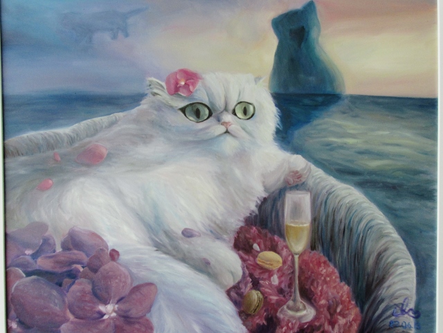 Hate cats? Steer clear. Felines are not only the main subject but also the inspiration for all of Prang’s works. In Sunset, a white Persian cat reclines on a luxurious bed of flowers, surrounded by macaroons and a champagne flute, as the sun sets over the sea in the background (indeed, the works are all fittingly titled). The single cloud in the sky is shaped like a cat, as is a pillar rising out of the water.