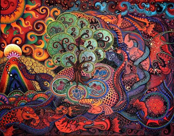 Showing turbulence and movement in her work, Katika combines different techniques from many art forms such as Asian batik textile, Australian aboriginal work, European arts and more. Her paintings communicate Buddhist folktales using elaborate imagery.