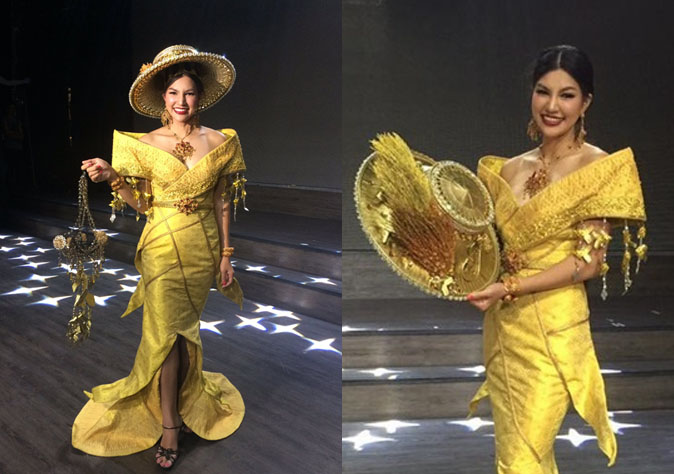Overall, the dress represents Thailand’s simplicity, belief, and abundance of food while the gold silk was selected to showcase our “Suvarnabhumi Kingdom”.