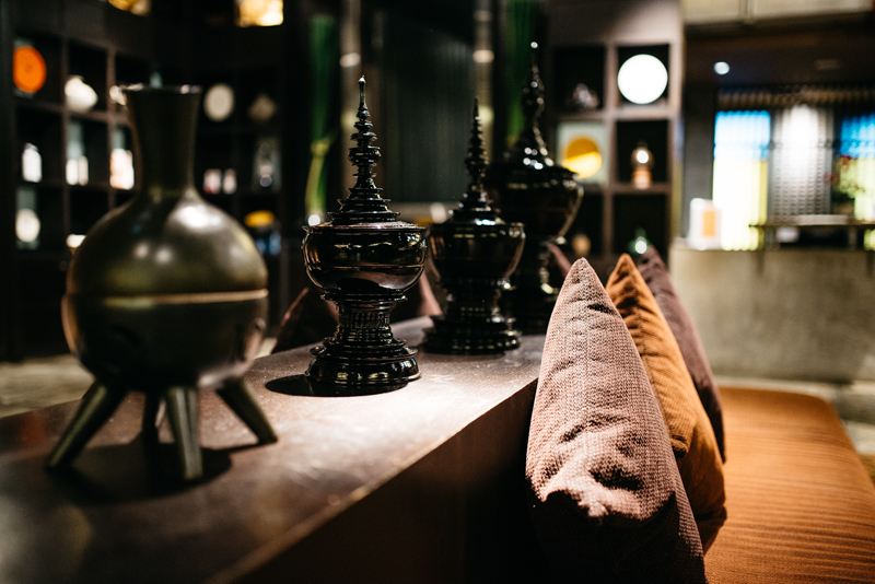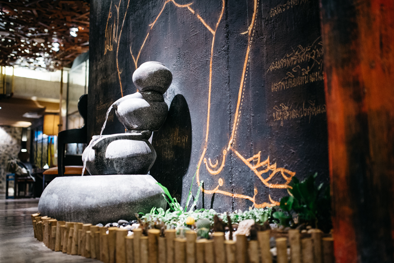A mythical giant, or yaak in Thai, roams the hotel. His eyes see all from the elevators. His head is painted on the top floor of the rooftop restaurant, and his feet are firmly planted in the lobby. His hands are working wonders in the spa.