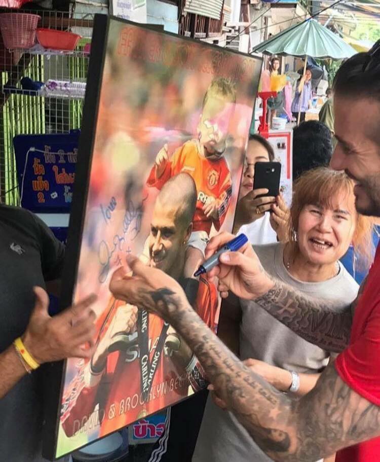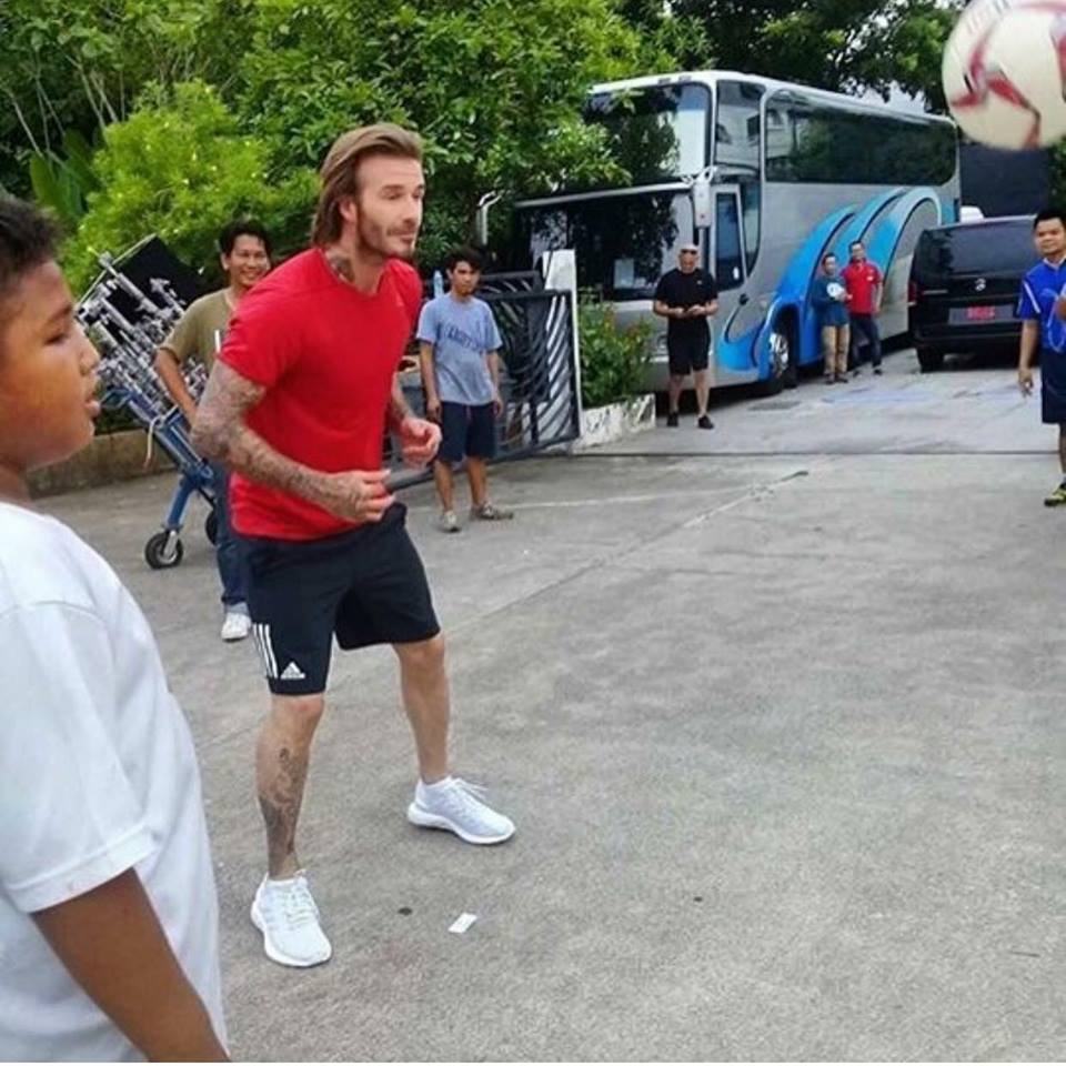 The 42-year-old former footballer was reportedly in Thailand to film a commercial for AIA insurance company. Photos from the shoot show Beckham signing a poster for fans and playing football with children.