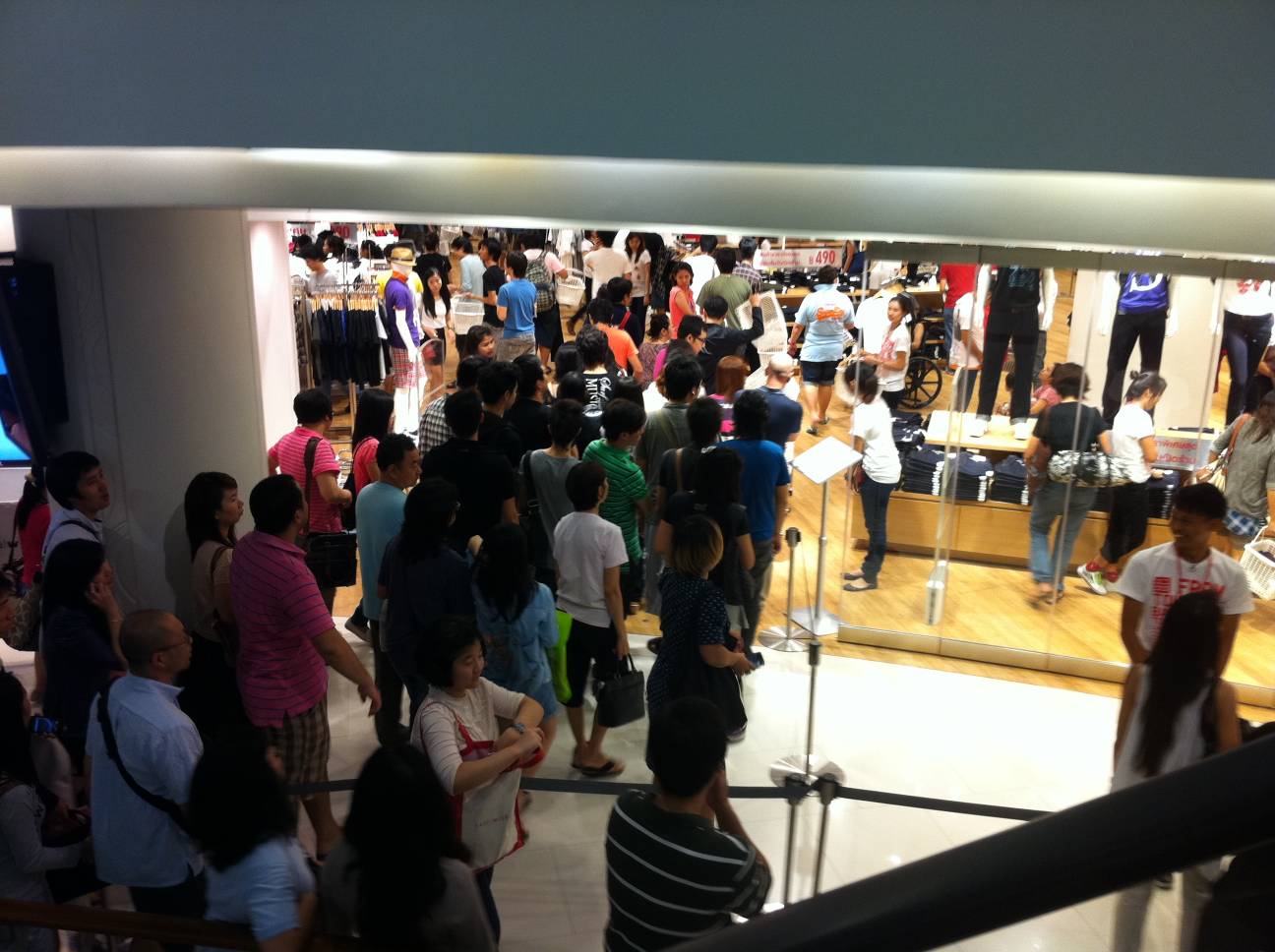 The first outpost in Thailand of cheap and cheerful Japanese fashion phenomenon Uniqlo opened at CentralWorld last weekend. Buoyed by an ubiquitous marketing campaign throughout Bangkok and lots of media hype, the massive store was inundated with customers. So much so that it had them waiting outside and ushered in by bouncers with headsets and clipboards a la Night at the Roxbury. Check out the photos.